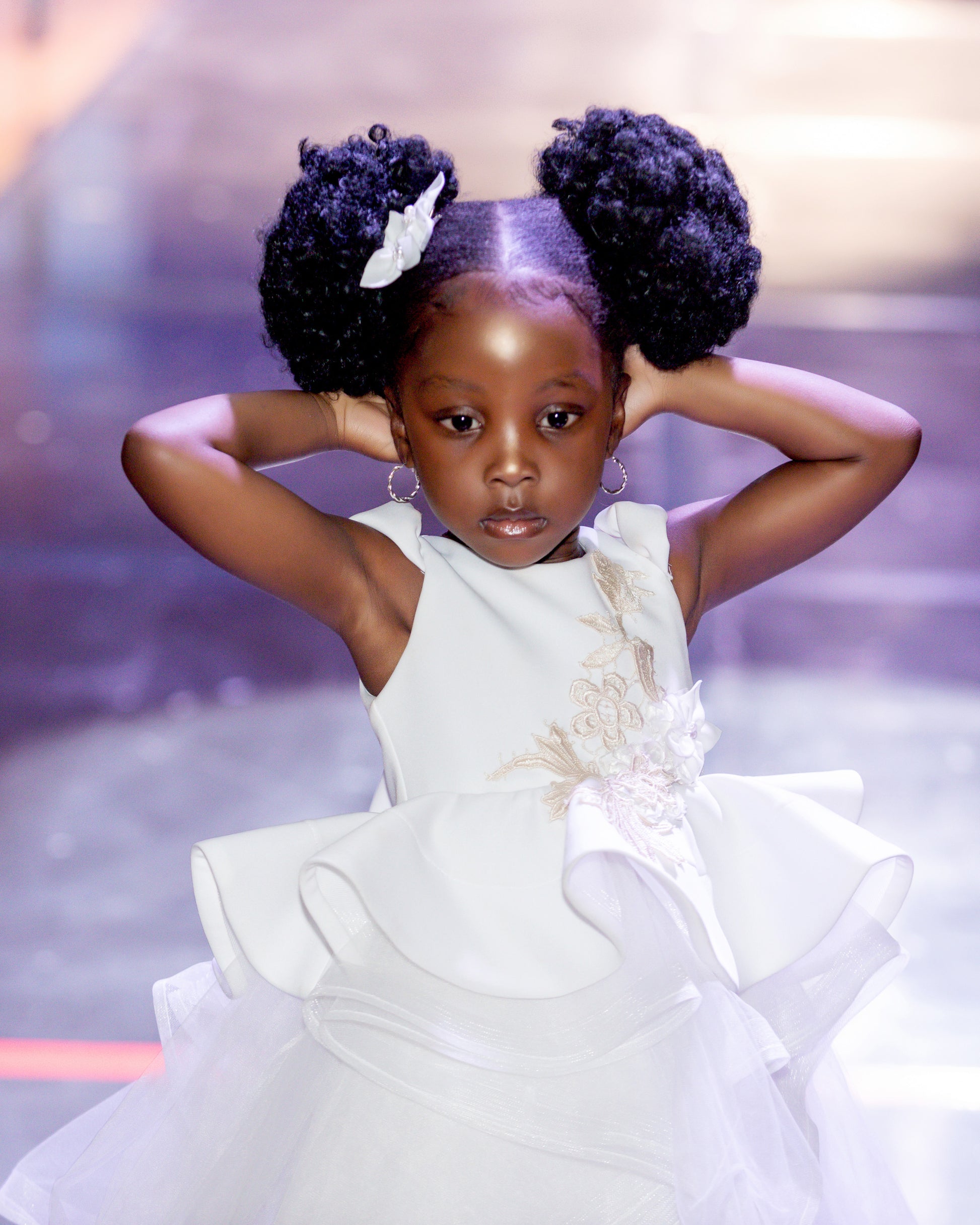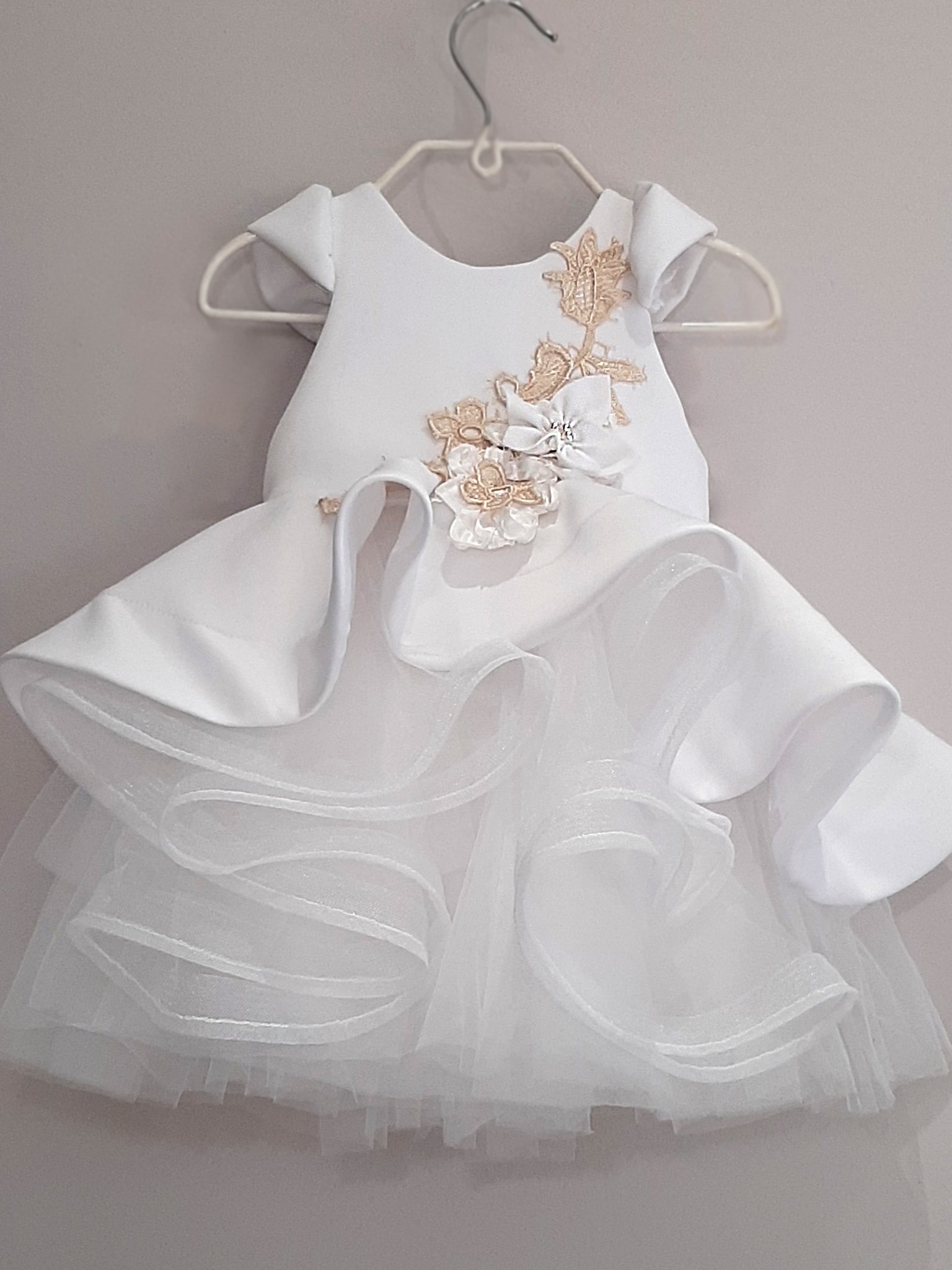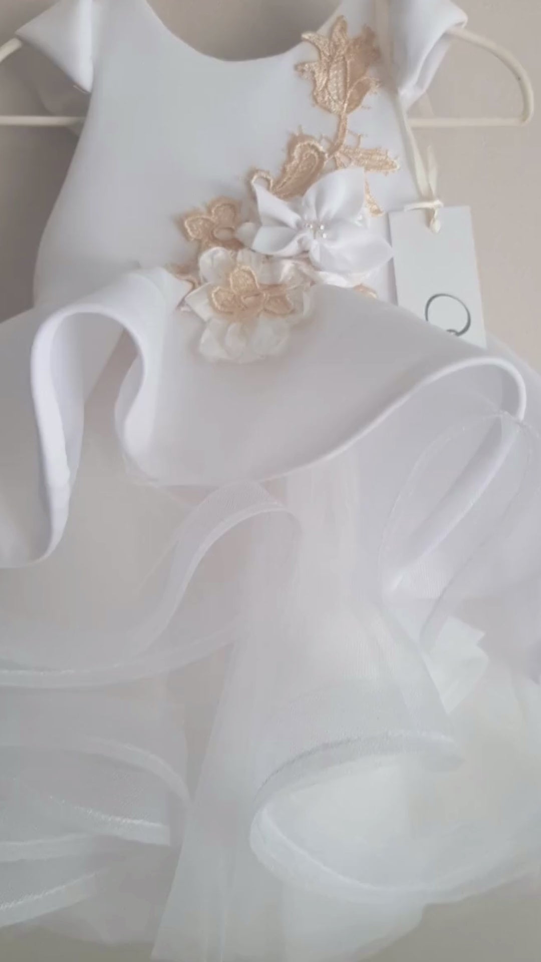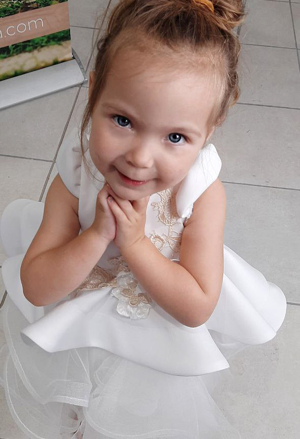 Featuring a peplum over a cascading tulle skirt, this dress is crafted from white sparkle tulle and scuba fabric, with exquisitely detailed 3D flowers and lace elements in white and champagne gold. Completing the look is a charming bow at the back.